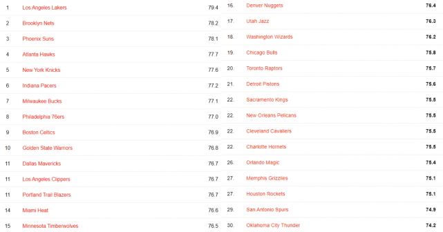 第1-10位:1.湖人(79.4)、2.篮网(78.2)、3.太阳(78.1)、4.老鹰(77.7)、5.尼克斯(77.6)、6.步行者(77.2)、7.雄鹿(77.1)、8.76人(77.0)、9.凯尔特人(76.9)、10.勇士(76.8);
