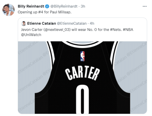 来源:178直播09-12 11:18178直播9月12日讯,篮网跟队记者Billy Reinhardt转发了杰旺-卡特新赛季改穿0号球衣的消息,写道:“为保罗-米尔萨普让出了4号。”25岁的杰旺-卡特是2018年的新秀,对于他来说,36岁的米尔萨普肯定是前辈了。