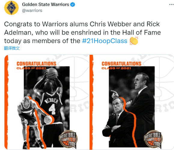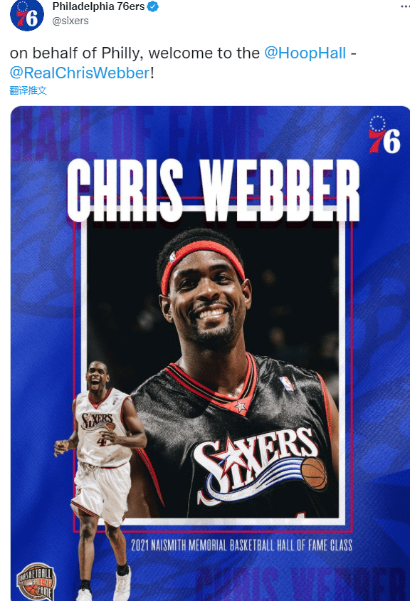 费城76人和勇士队都恭喜韦伯入选名人堂,韦伯曾在勇士和76人打过比赛,生涯从勇士开始也是从勇士结束,巅峰期在国王;NBA官方也晒出韦伯的生涯荣誉,恭喜韦伯入选名人堂。