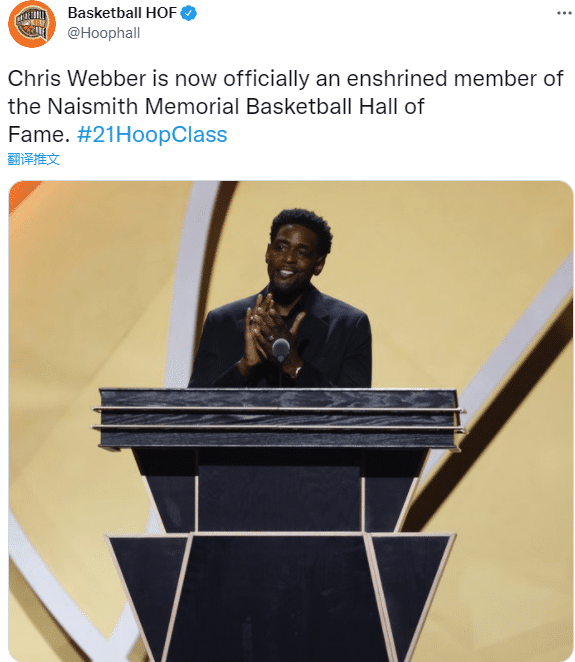 奈史密斯名人堂官方宣布,克里斯-韦伯正式入选名人堂,晒出韦伯演讲鼓掌照。