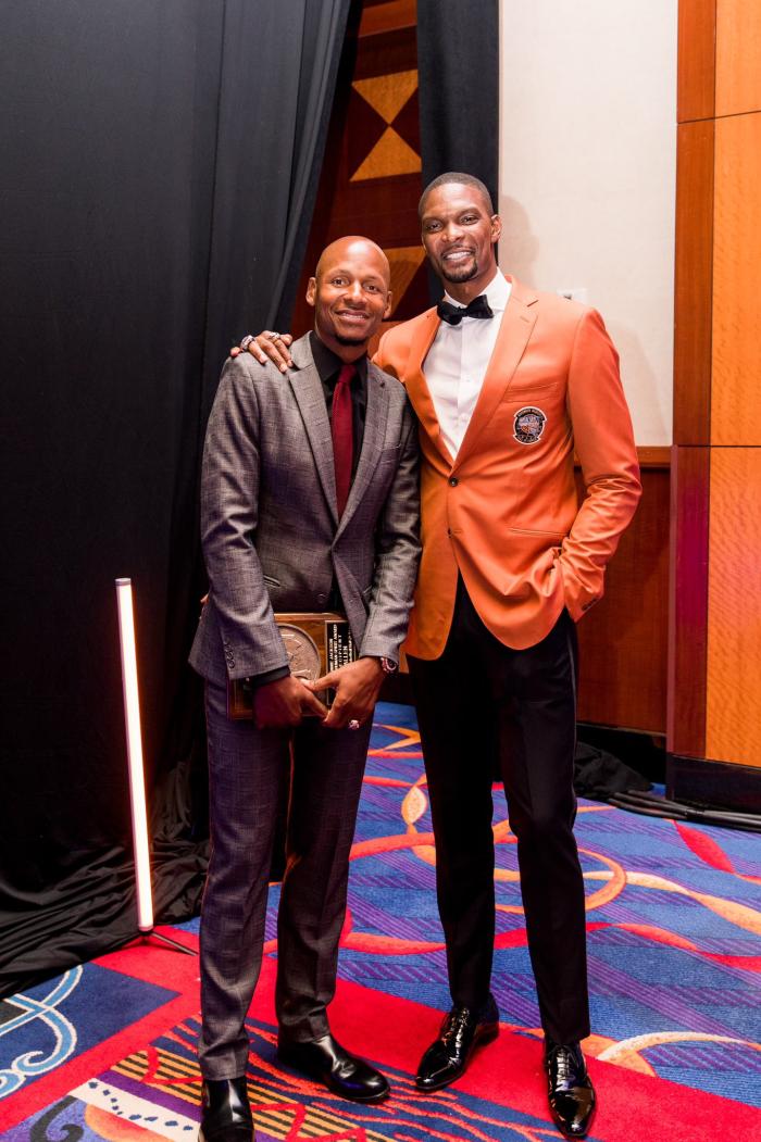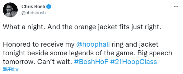 参加入选庆典之后,波什晒出身穿名人堂外套以及与雷-阿伦合影(雷-阿伦是波什的推荐人)等多张照片,发推配文:多么美好的夜晚,橙色外套太棒了,很荣幸在一些传奇的身边收到我的名人堂外套和戒指,等不及明天的演讲了。