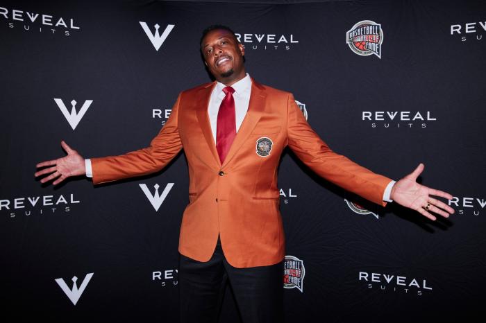 44岁皮尔斯站在C位满脸笑容,波什也穿上橙色外套,他和克里斯-韦伯都站在皮尔斯的一旁,公牛名宿库科奇和活塞名宿本-华莱士站在最边上,胡子和头发都白了,其中大本神情严肃;NBA众名宿合影之后,他们都拍摄名人堂个人定妆照。