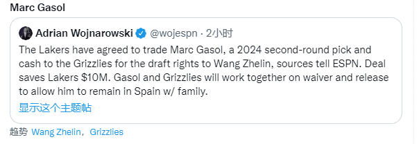 大交易达成之后,马克-加索尔、王哲林和灰熊三个关键词冲上推特热搜;名记沃纳罗斯基后续跟进报道,灰熊将会裁掉小加索尔,从而能让小加继续留在西班牙陪伴家人,之后湖人官宣交易达成。