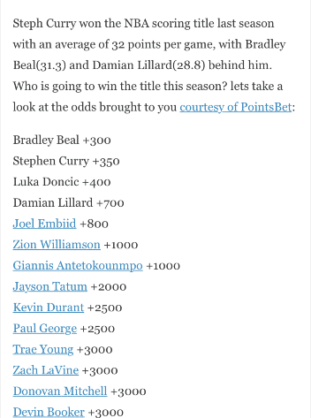 来源:178直播09-08 15:24178直播9月08日讯 还有一个多月时间,NBA新赛季将会正式开始,等待了几个月时间的球迷们早就已经是迫不及待了,大家都希望看到球星们在赛场上大放异彩的样子。对于常规赛阶段,大家最关心的事情除了常规赛战绩之外,各类常规赛奖项也能引起注意。其中得分王无疑是一个十分重量级的个人奖项,而这个奖项每一年的获得者都有可能不同。近日就有媒体给出了NBA新赛季的得分王赔率,谁才是最有可能拿到得分王的球员呢?