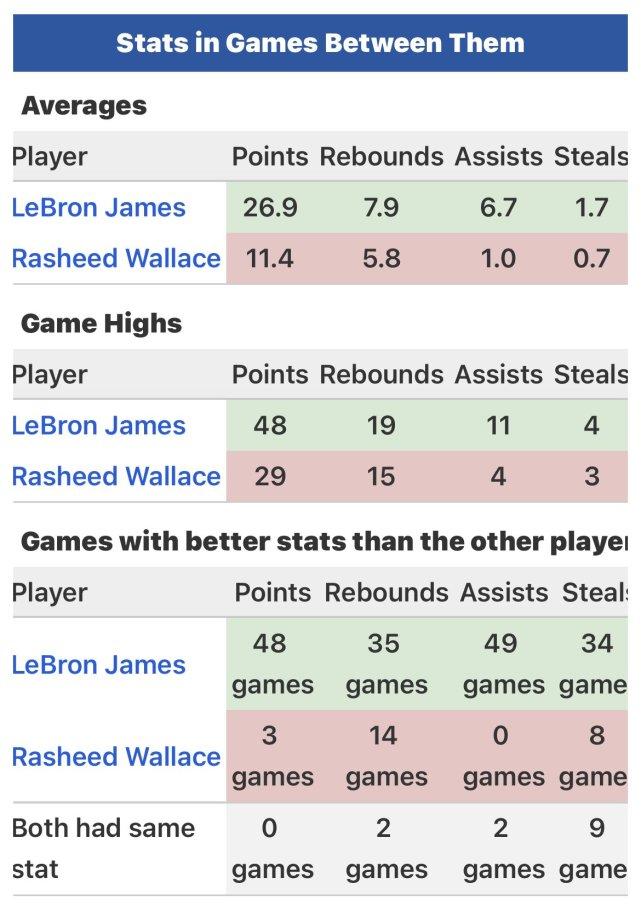还有球迷晒出了两人对阵的具体数据对比。两人之间的51次交手,詹姆斯场均26.9分7.9篮板6.7助攻1.7抢断,拉希德场均11.4分5.8篮板1助攻0.7抢断。51次交手中,詹姆斯最高得分是48分,拉希德是29分;詹姆斯最高篮板是19个,拉希德是15个;詹姆斯最高助攻是11次,拉希德是4次;詹姆斯最高抢断是4次,拉希德是3次。51次交手中,詹姆斯得分占优48次,篮板占优35次,助攻占优49次,抢断占优34次。