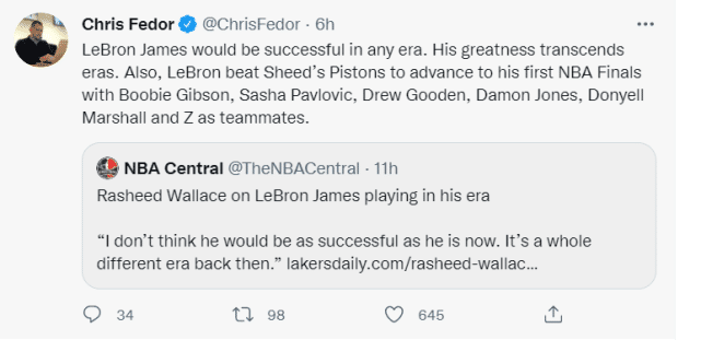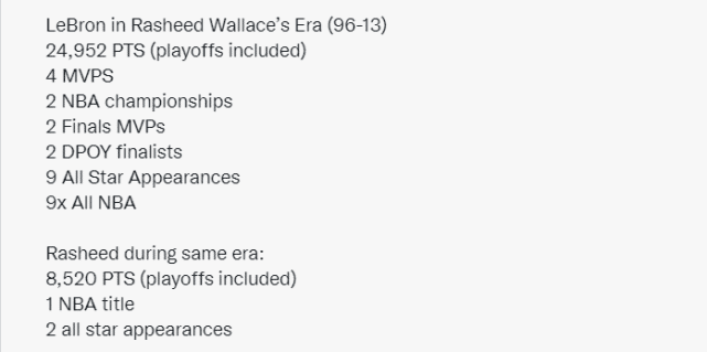 球迷们也就此事展开讨论。有球迷晒出了拉希德和詹姆斯在同一时代里,也就是拉希德打球的时代(1996-2013年)取得的成就对比。詹姆斯在此期间得到24952分(包含季后赛),4个常规赛MVP,2个总冠军,2个总决赛MVP,9次入选全明星,9次入选最佳阵容。同期的拉希德得到8520分(包含季后赛)、1个总冠军和1次入选全明星。