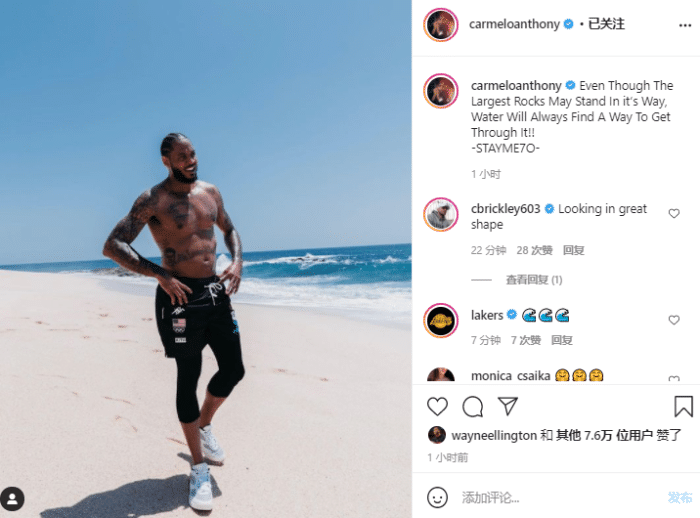 湖人新援安东尼更新社交媒体,晒出一张赤裸上身的海滩照,并且配文:即使最大的石头挡路,水也有办法穿过它。