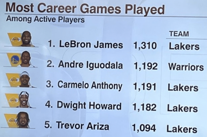 第一名是目前效力于湖人的詹姆斯,这名老将职业生涯先后效力过骑士、热火。可以说,詹姆斯是轻伤不下火线之人,不会战略性进行休战。截止上个赛季,詹姆斯一共出场了1310次常规赛,是现役球员中最多的。该榜单前五人,湖人就占了四人之多。第二名是重回勇士的伊戈达拉,一共在常规赛阶段打了1192场比赛。