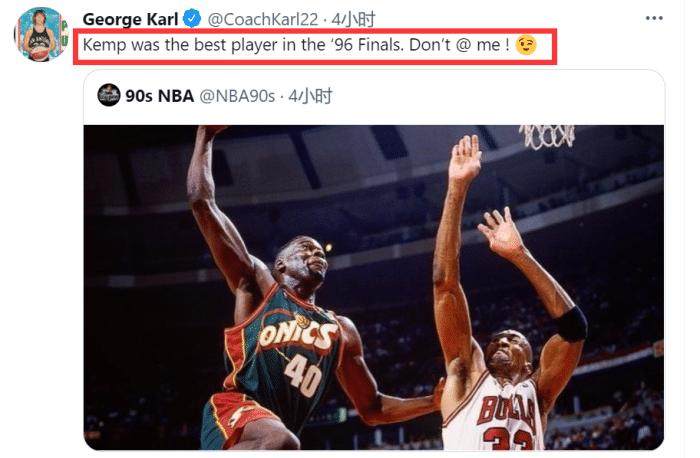 96年的总决赛,从数据上看,乔丹和坎普的确不相上下,所有坎普当时获得了3张FMVP的选票,也在情理之中。而当年执教超音速的主帅乔治卡尔今天也在社媒上表示:坎普是1996年总决赛中最棒的球员。