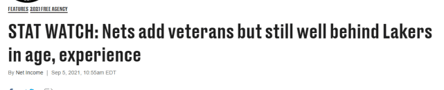 联盟里最老的10位球员中,有4位在湖人,他们是安东尼、詹姆斯、小加和阿里扎,篮网有1位,是米尔萨普。联盟里最老的20位球员中,有6位在湖人,有2位在篮网。篮网在这个休赛期新增了4位至少32岁的球员,而湖人新增了8位至少32岁的球员。
