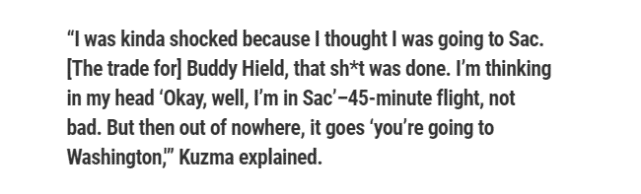“我有点惊讶,因为我原以为自己要去萨克拉门托了。我以为关于希尔德的那笔交易搞定了,所以当时我的想法是‘好吧,我要去萨克拉门托了,45分钟的飞行时间,还不错。然后,突然之间,变成了‘你要去华盛顿了’。”库兹马在节目上说道。
