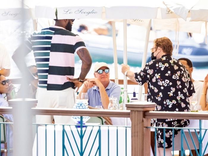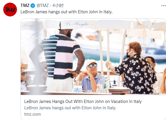 在豪华游轮上,詹姆斯夫妇与英国摇滚音乐巨星埃尔顿-约翰一同享受意大利美食;老詹还在餐桌旁,一边唱歌一边跳舞,兴奋地跳起舞来,手舞足蹈十分惬意。