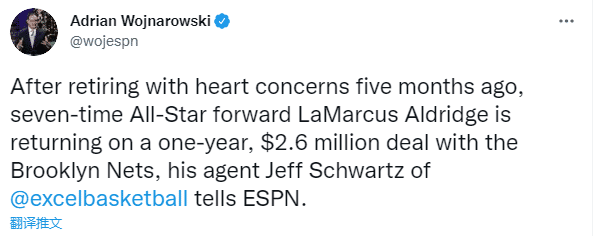 上赛季被马刺买断后,阿德为篮网打了5场比赛,担任球队首发内线,场均上场25.9分钟能够拿到13.5分4.5篮板和1.9助攻1.1盖帽,仅为篮网打5场,对阵湖人赛后,他宣布因心律不齐的心脏问题而退役;如今阿德重返篮网,美媒Hoop Central发推:为阿德重返联盟而高兴。