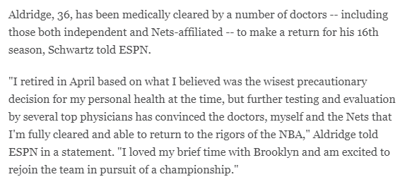 他表示:我在4月份退役,当时我认为这是对我个人健康最明智的预防性决定,但几位顶级医生的进一步测试和评估让医生、我自己和篮网确信,我已经完全康复,能够重返NBA,我喜欢我在布鲁克林的短暂时光,很高兴能重新加入球队,继续追求总冠军。