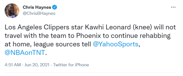 来源:178直播06-20 10:46178直播讯 北京时间6月20日,据名记克里斯-海耶斯报道,快船球星科怀-莱昂纳德因膝伤将不会随队前往菲尼克斯,他将继续留在洛杉矶进行康复。美媒跟进报道称,这意味着他大概率至少缺席西部决赛的前两场比赛。