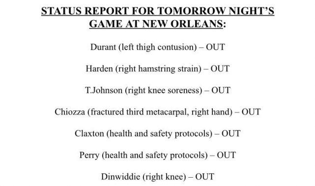 来源:178直播04-20 16:24178直播讯 北京时间4月20日,篮网官方公布了明天客场对鹈鹕的伤病名单,多达七名球员被贴上了OUT(缺席)的标签。杜兰特(左大腿挫伤)、哈登(右腿筋拉伤)、泰勒-约翰逊(右膝酸痛)、齐奥扎(右手骨折)、克拉克斯顿(健康安全协议)、佩里(健康安全协议)、丁威迪(右膝伤病)都不能出战这场比赛。这意味着欧文将单核带队来打这场比赛。