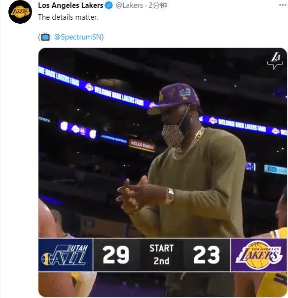 来源:178直播04-20 16:07178直播讯 湖人和爵士比赛中,詹姆斯因伤继续缺席比赛,继续坐在场边为队友加油打气,期间詹姆斯突然变身詹指导,穿金戴钻十分抢镜,站在湖人替补席指导队友,湖人官方晒出这一幕,发推写道:细节很重要;球迷调侃不好好管理饮水机,居然兼职教练了。