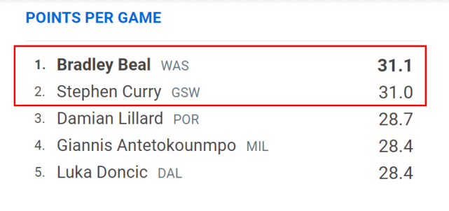 只差0.06分!库里场均31分离比尔更近了,时隔5年再捧得分王?