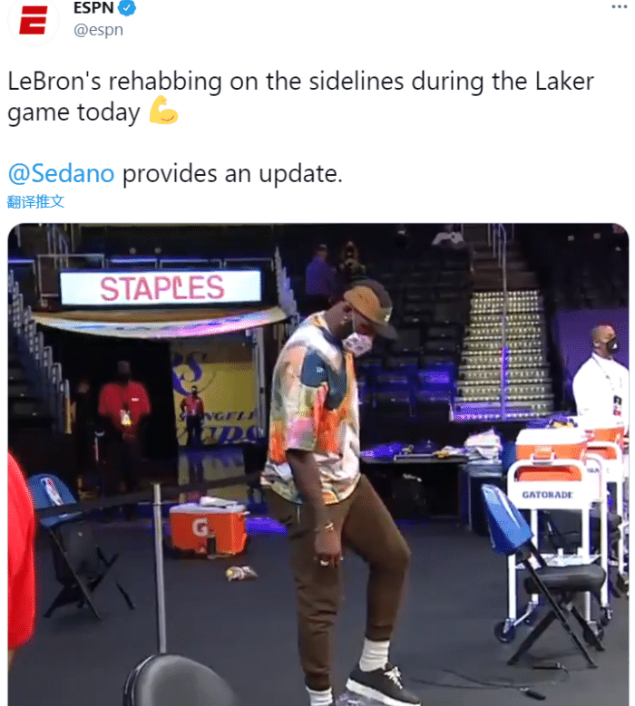 在比赛的过程中,转播方也给到詹姆斯的画面。画面显示,詹姆斯正在双脚踩着一个平衡垫,进行平衡性训练。而根据Sedano的报道,詹姆斯在2017年也曾遭遇类似伤病,当时花了接近4周左右的时间恢复。这一次,詹姆斯有可能字接下来的一两周内复出