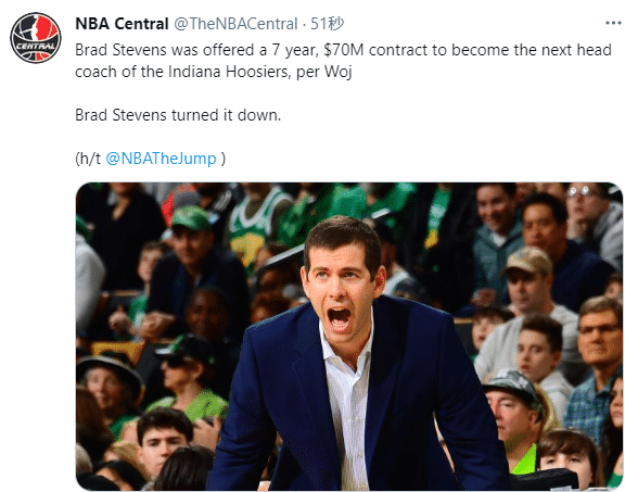 来源:178直播04-18 15:30178直播讯北京时间4月18日,据ESPN名记沃纳罗斯基报道,凯尔特人主帅布拉德-史蒂文斯拒绝了一份来自印第安纳大学7年7000万美元的主教练合同;少帅拒绝7年7000万美元大合同,年薪高达千万美元,目前史蒂文斯年薪不详,去年他和球队达成提前续约合同。