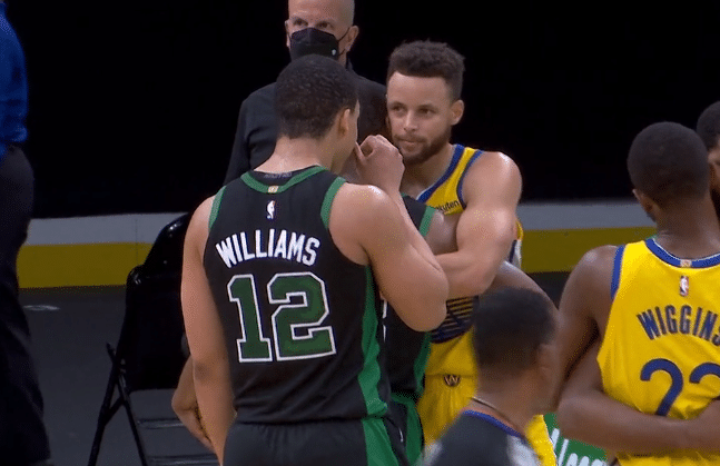 勇士输球赛后,库里表情有些沮丧,输球自然有些难受,不过随后1米90库里和2米26法尔站在一起,身高相差36公分,堪称最萌身高差;不知他俩说了什么话,库里突然咧嘴大笑,沮丧心情瞬间没了,离场时,库里还把佩戴的东西送给球迷。