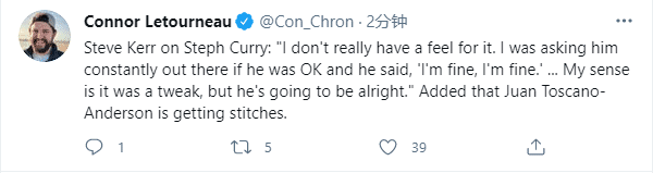 赛后谈到库里带伤出战,勇士主教练科尔表示他一直问库里脚踝伤势,库里一直说自己感觉很好;回到更衣室,库里第一时间接受脚踝治疗;科尔还谈到悍将安德森,他表示安德森在更衣室里接受缝针治疗,脑袋被划破;科尔还盛赞安德森的职业精神:安德森是竞争者,球队想要的那个人。