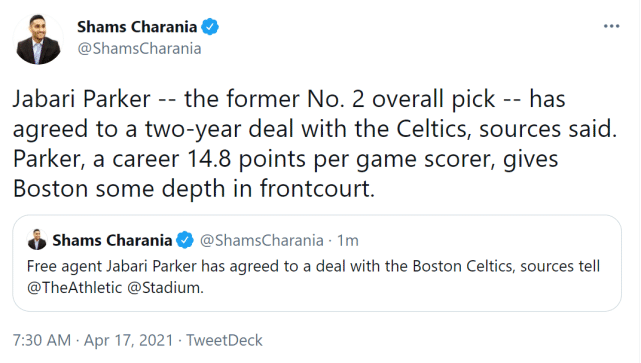 26岁的贾巴里-帕克是2014年选秀大会的榜眼签,当时被雄鹿选中。生涯至今,帕克效力过雄鹿、公牛、奇才、老鹰和国王。2020年2月,他被老鹰交易到国王,2021年3月25日,他被国王裁掉,成为自由球员。