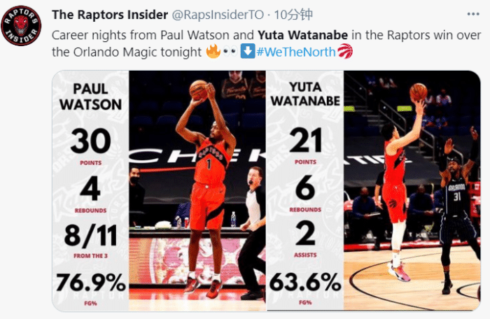 值得一提的是,这已经是渡边雄太过去6天之内,第二次创下生涯得分新高。对阵骑士的比赛,他拿下14分刷新新高。6天过后,他用21分再次刷新生涯新高。如此表现,他很有机会在猛龙的轮换阵容中立足。