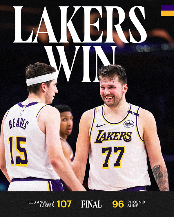 下半场,第三节湖人一度被追到9分,但东契奇身背4犯以及意外崴脚仍坚持带队,湖人众将顶住太阳的反扑,三节打完湖人领先12分;末节湖人牢牢掌控局面,关键时刻东契奇连续5分,芬尼-史密斯轰进三分,里夫斯抢断彻底杀死比赛,最终湖人稳稳拿下胜利。