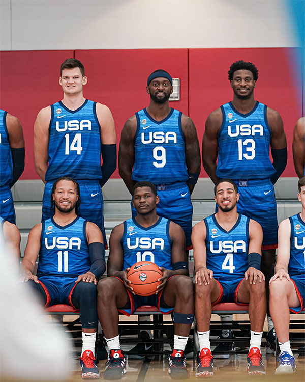 美国男篮总经理格兰特-希尔、助教泰伦-卢、英格拉姆、班凯罗、凯斯勒、波蒂斯、小贾伦-杰克逊、卡梅隆-约翰逊和布里奇斯都站在第二排。