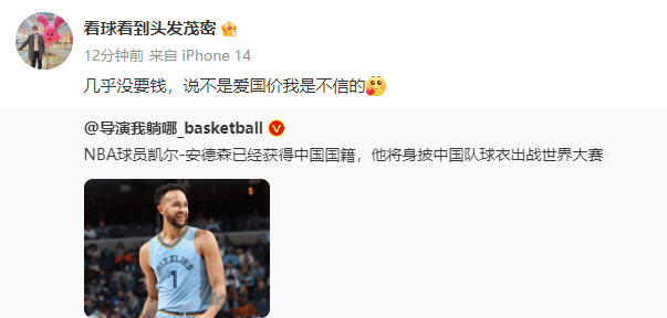 曝李凯尔获得中国国籍,预计将为中国男篮出战世界杯,有望在7月份来到中国和国家队汇合。杨毅助理“看球看到头发茂密”发微博表示,安德森来中国男篮几乎没要钱;他微博写道:几乎没要钱,说不是爱国价我是不信的。