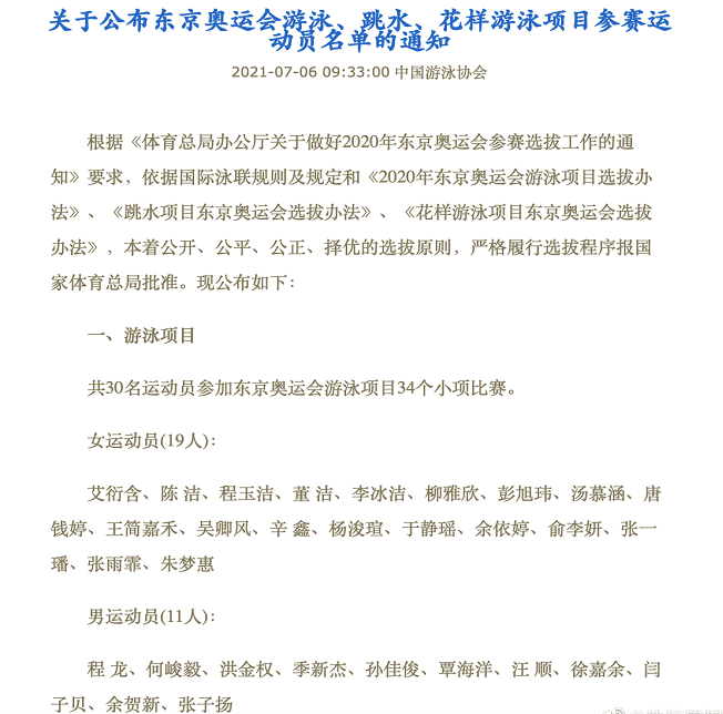 来源:178直播07-06 11:29178直播讯 7月6日,中国游泳队公布了参加东京奥运会游泳项目34个小项比赛的运动员名单,一共30名运动员,其中男队11人,领军人物是徐嘉余。女队19人,领军人物是王简嘉禾。孙杨禁赛4年3个月,提前无缘东京奥运会,叶诗文、刘湘和傅园慧也都落选奥运会参赛名单。