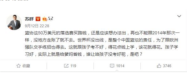 值得一提的是此前苏群就发文表示希望篮协可以花费这50万美元购买资格,就跟孩子考不好,得花点钱上学,该花就得花,为了跟欧洲强队交手练招也得去。不过可惜的是中国男篮表现不佳,没有晋级到下一个阶段。