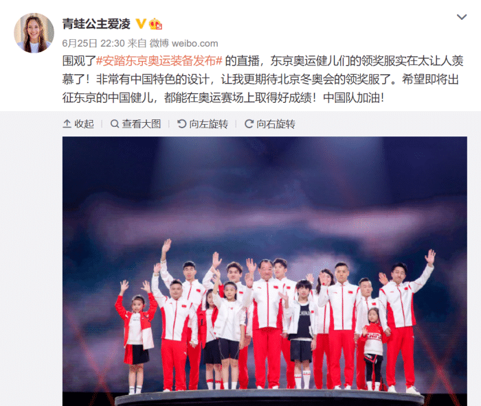 奥运冠军许海峰、邹市明、龙清泉、董栋、赵帅等选手,身穿着东京奥运健儿们的领奖服。这一条服装是小立领、一字扣等中式元素与运动版型完美结合,简直是“高端大气上档次”。而作为2022北京冬季奥运会的中国滑雪选手谷爱凌,也对于发布会十分关注。她表示自己对于东京奥运健儿们的领奖服很羡慕,同时希望即将出征东京的中国健儿,都能在奥运赛场上取得好成绩。