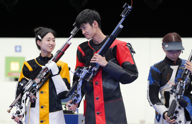 在射击项目混合团体10米气步枪比赛中,17岁的黄雨婷和19岁的盛李豪组成的中国组合发挥出色。他们首先打出632.2环,以小组第一的成绩晋级金牌赛。在金牌赛中,两人配合默契,以16-12的总比分击败韩国选手,成功夺得巴黎奥运会的首枚金牌,同时也为中国代表团斩获了本届奥运会的首金。中国队连续两届在这一项目上夺金,彰显了在射击领域的持续优势。
