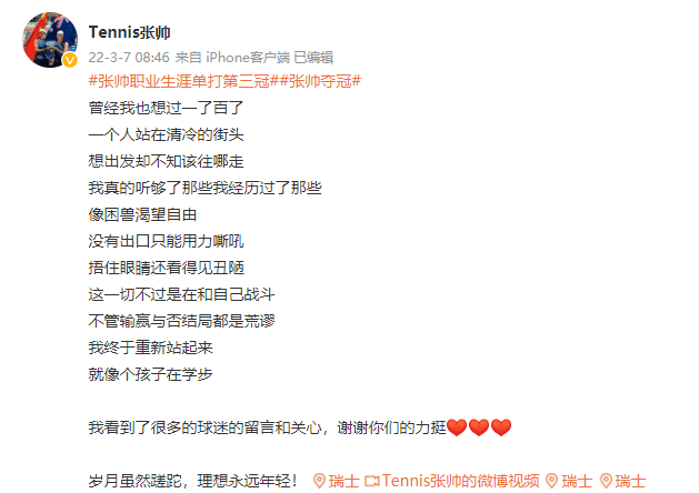 张帅写道:“曾经我也想过一了百了,一个人站在清冷的街头,想出发却不知该往哪走,我真的听够了那些我经历过了那些,像困兽渴望自由,没有出口只能用力嘶吼,捂住眼睛还看得见丑陋,这一切不过是在和自己战斗,不管输赢与否结局都是荒谬,我终于重新站起来,就像个孩子在学步。我看到了很多的球迷的留言和关心,谢谢你们的力挺。岁月虽然蹉跎,理想永远年轻!”