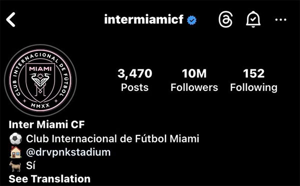 梅西加盟带来的效应还在延续,迈阿密国际的社交媒体粉丝量已经突破1000万,迎来里程碑的时刻。要知道从梅西自己决定加盟迈阿密国际时,球队的社媒粉丝数量仅仅17万,如今暴涨到千万级别,而且数字还在继续提升。