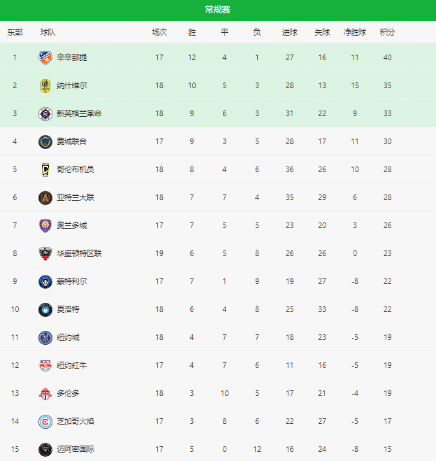 美国职业大联盟分为东部和西部,进行常规赛和季后赛,决出总冠军,赛制和NBA很相似。目前东部第一是辛辛那提,他们17轮拿下40分,稳居榜首,第二名是35分的纳什维尔,他们比榜首球队多赛一场,新英格兰革命和费城联合排名第三和第四。西部榜首球队是圣路易斯城,洛杉矶FC与第一名积分相同,但多赛一场。洛杉矶银河与科罗拉多急流排名垫底。