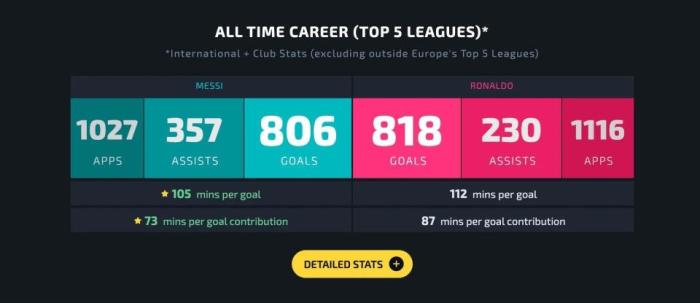 梅西:163次出场,129球、40次助攻,平均每105分钟打入一球,平均每80分钟制造一球。