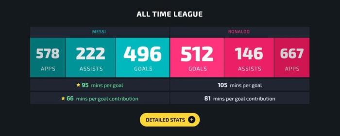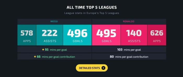 梅西:578次出场,496球、222次助攻,平均每95分钟打入一球,平均每66分钟制造一球。