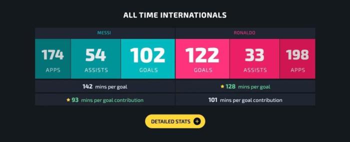 国家队进球数落后C罗20球,出场次数落后24次的梅西,能否实现最终反超,依然需要时间来揭晓答案。