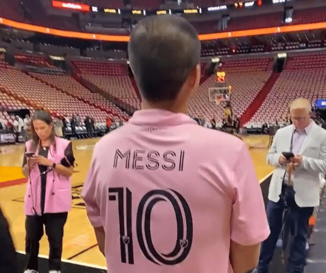 迈阿密的球迷们也疯狂了,已有球迷身穿梅西10号球衣现身迈阿密热火主场美航球馆,这里将进行万众瞩目的NBA总决赛。