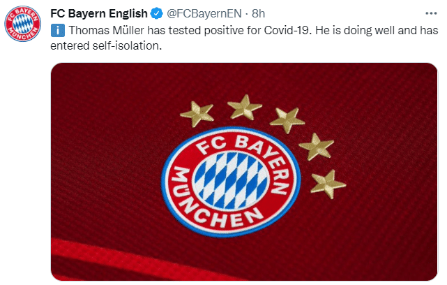 拜仁官方:穆勒感染新冠,已被隔离