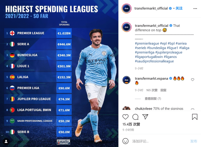 178直播讯 德国转会市场今天统计了这个夏季转会窗各个联赛的烧钱情况,英超以10.2亿欧元排名第一。