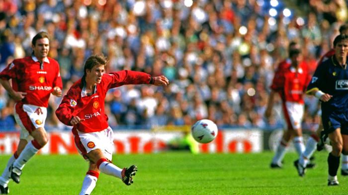 1996/97赛季首轮,曼联在主场迎战温布尔登,刚刚改披10号战袍的贝克汉姆,在中线之后接到队友的后场断球,老特拉福德灿烂的阳光下,小贝转过身去,抬头看了一眼门将尼尔·苏利文的站位,果断挥起右脚吊射,皮球划出一道美丽的弧线,飞越了57码的距离,直接坠入网窝。